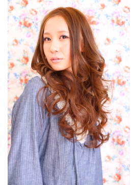 センターパートの重めフォルムでおしゃれロングスタイル。顏周りはタイトにおさえても中間からのパーマで華やかさ抜群のおすすめスタイルです!! |